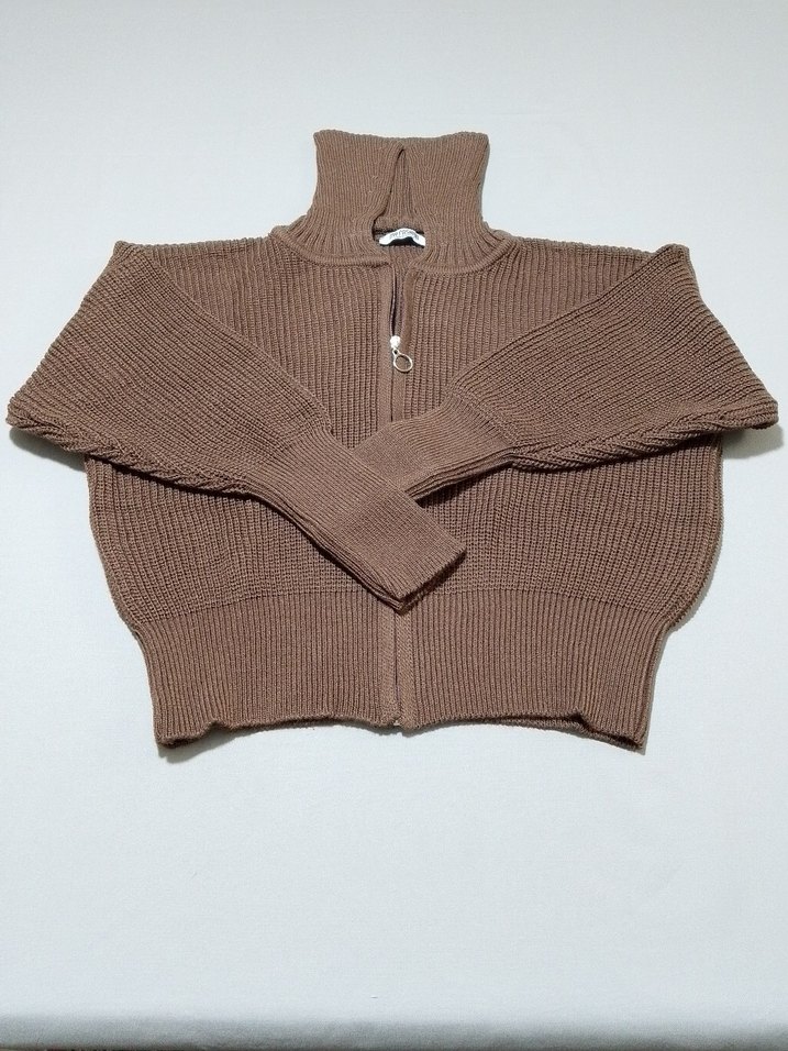 Kahverengi kısa boy, dik yaka, uzun kollu kadın fermuarlı kazak, örme dokusuyla sokak stiline uygun rahat bir parça.