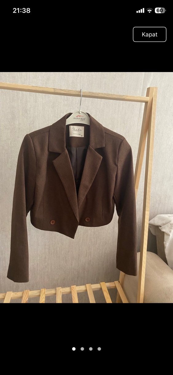 Koyu kahverengi kadın blazer, kesik yaka ve düğmeli ön detaylara sahiptir. Uzun kollu, kısa ve regular fit, hafif desenlidir, ofis için uygundur.