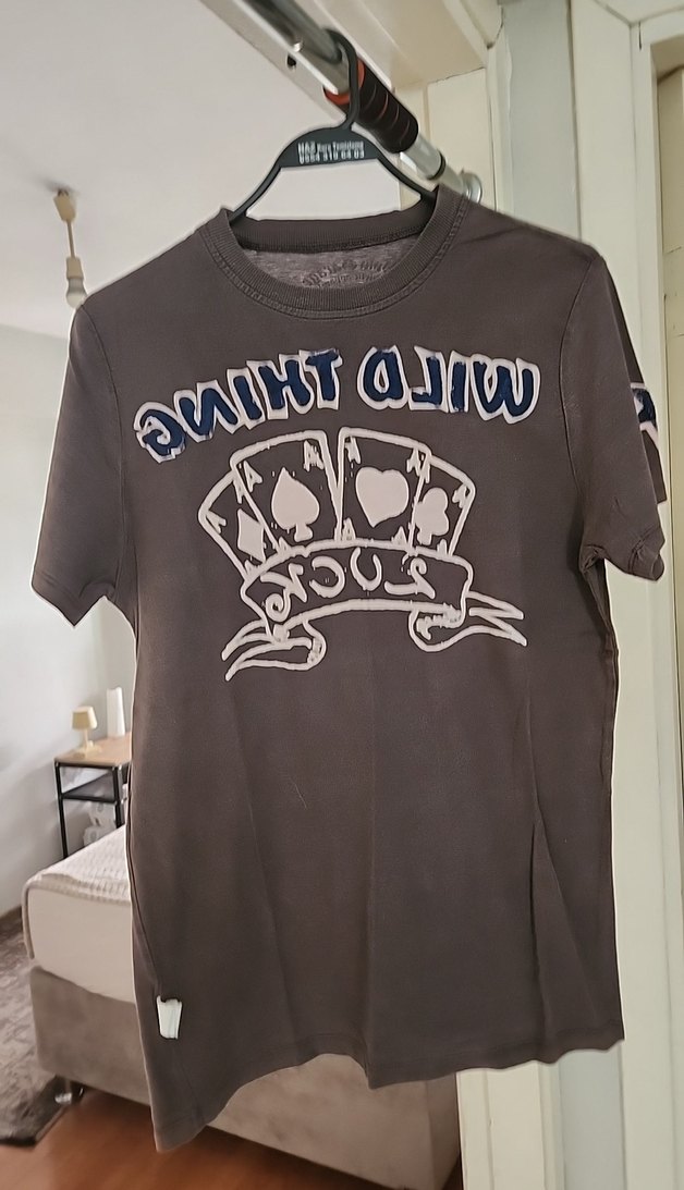 Pamuklu, düğmeli detaylı, bol kesim ve bisiklet yaka kahverengi kisa kollu erkek tişörtü. Baskılı tasarımıyla rock punk havası verir.