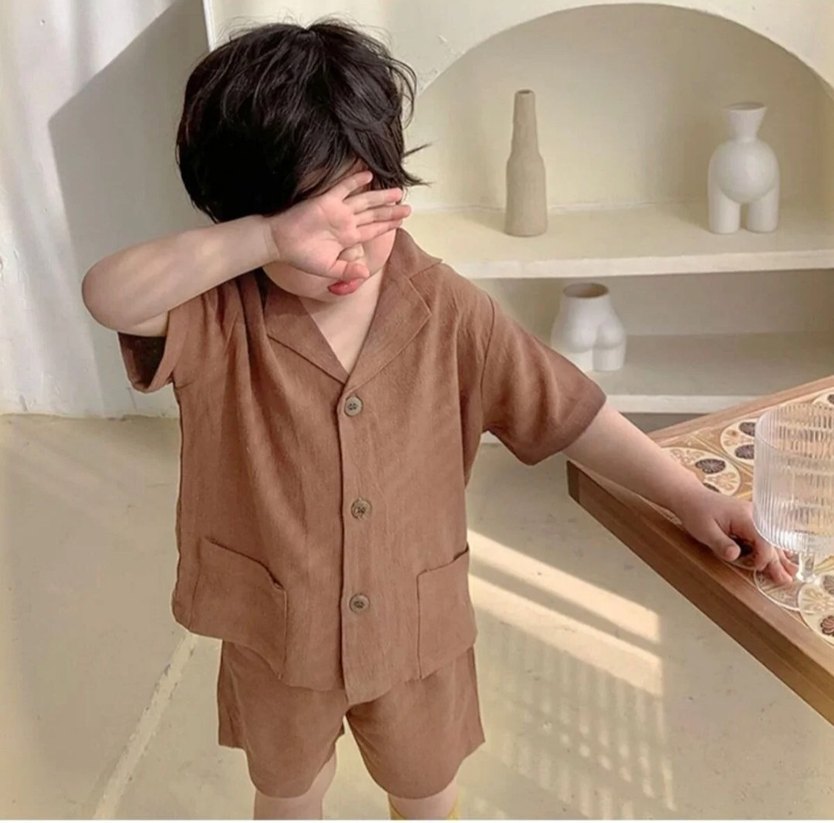 Kahverengi, kısa kollu, düğmeli ve cepli bol kesim çocuk takımı, rahat ve şık bir görünüm sunar. bazı yerinee ip çekilmeleri var 4 5 yaş