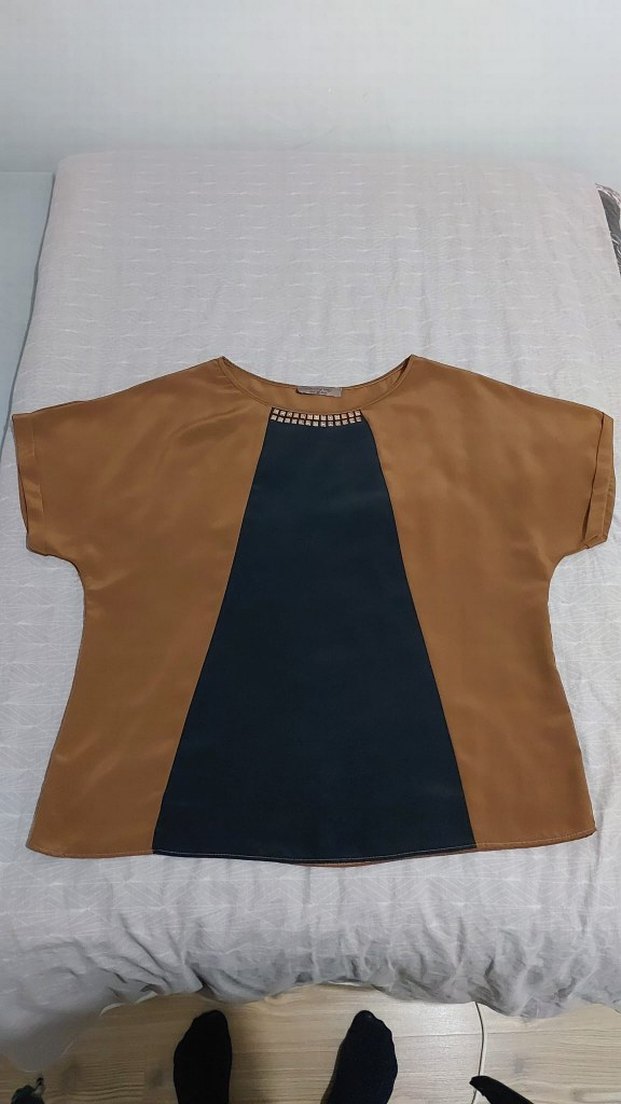 Kadınlar için kısa kollu, yuvarlak yakalı, sentetik kumaştan yapılmış bol kesim kahverengi bluz. Bel detaylı ve önünde koyu renk panel bulunur, gündelik kullanım için uygundur.
