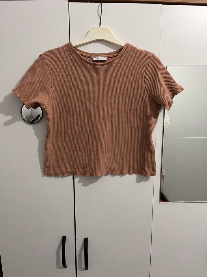 Kahverengi, kısa kollu, kısa kesim ve bisiklet yaka olan bu ince keten tişört, günlük kullanım için sade ve rahat bir stil sunar.
