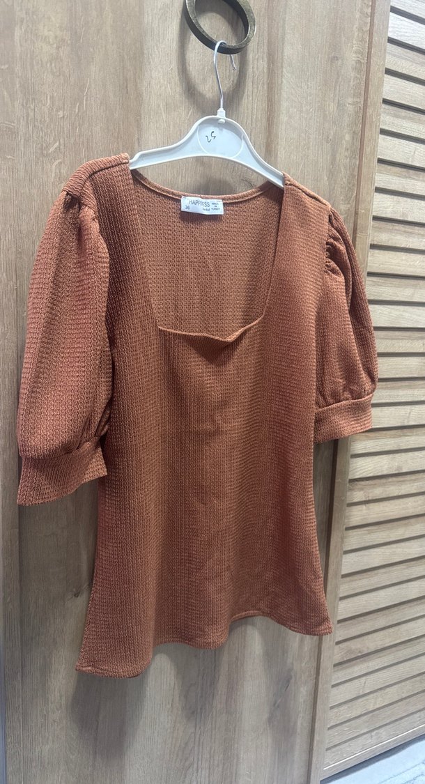 Kahverengi, kısa kollu, triko kadın bluz, yuvarlak yakalı ve bol kesimdir. Rahat ve kısa boyda, günlük kullanıma uygundur.
