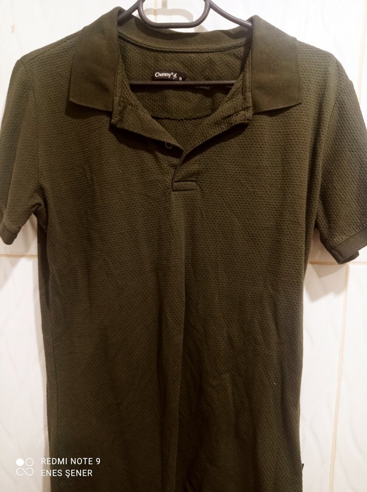 Kahverengi kısa kollu polo tişört, düğmeli yakası ve bol kesimi ile yumuşak sentetik kumaştan üretilmiştir, günlük rahat kullanım için uygundur.