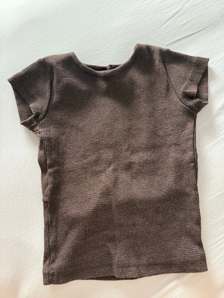 Yumuşak dokulu, desenli olmayan koyu kahverengi kısa kollu tişört.