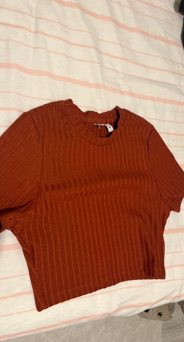 Kahverengi parlak keten kumaştan, kısa kollu ve bisiklet yaka, normal boyda, sade ve rahat tişörtü.