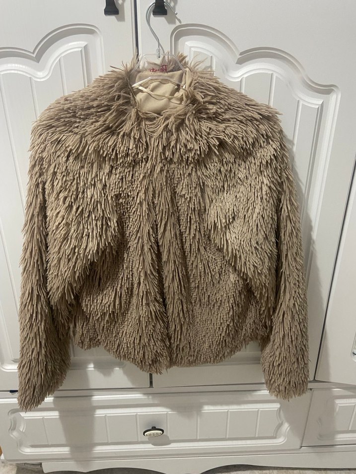 Kahverengi, uzun kollu, kürk detaylı ve yün kumaştan yapılmış kadın ceketi. Bohem ve retro tarzda, günlük kullanıma uygun.
