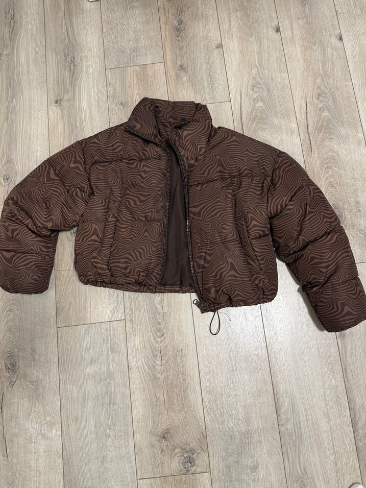 Kahverengi zebra desenli, fermuarlı, yüksek yakalı ve uzun kollu kadın mont. Orta boy uzunlukta, sıcak ve rahat kumaştan yapılmıştır.