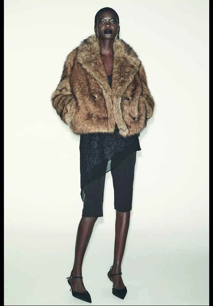 Kahverengi kısa suni kürk ceket, deri detaylar ve askılı kollarla sokak modasına uygun, bol kesim ve kesik yaka ile günlük kullanıma uygun.