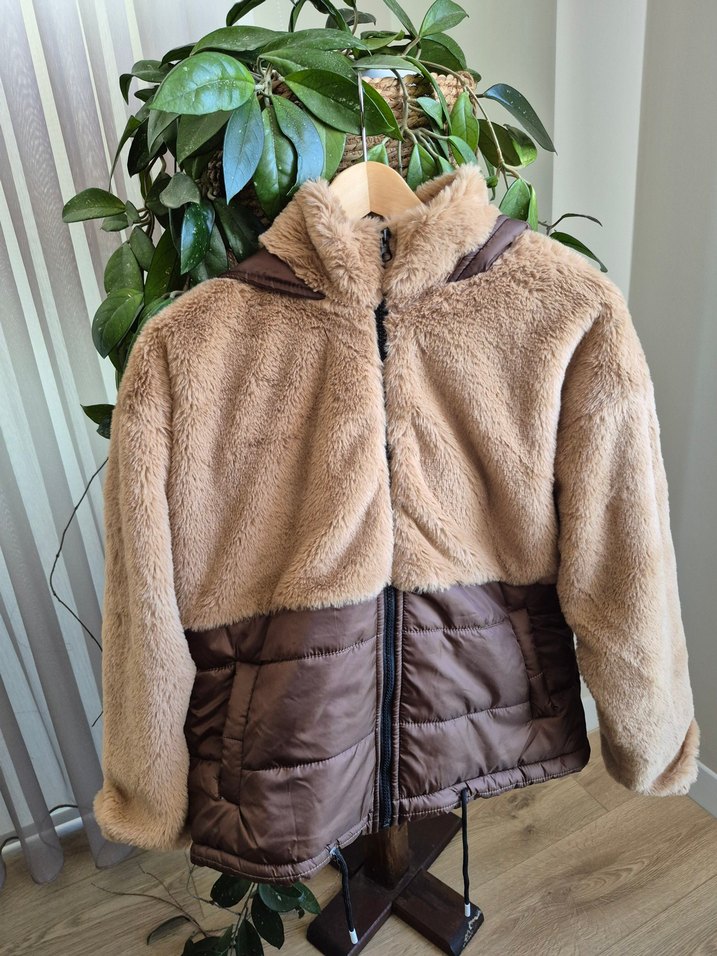 Kadınlar için kısa kesim, bol kalıp ve suni kürk detaylı yumuşak ve sıcak kumaştan yapılmış kışlık mont. Notlu yaka ve uzun kollu, koyu kahverengi tonlarda rahat sokak stiliyle birleşiyor. ❄️