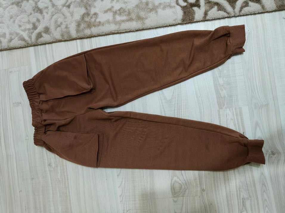 Kahverengi, yumuşak ve sıcak kumaştan salaş kesim midi boy eşofman altı. Desensiz ve rahat şıklık sunar, günlük kullanıma uygundur.