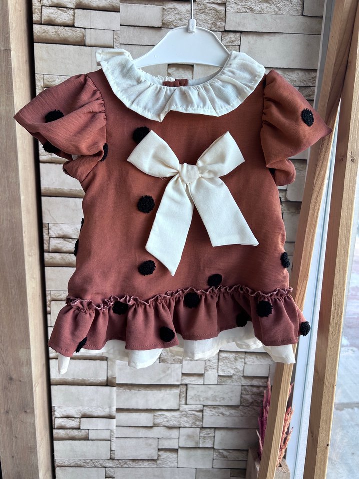 Kahverengi pamuklu kız çocuk elbisesi, kısa kollu, fırfırlı etek ucu, yuvarlak yaka ve bol kesim, fiyonk ve baskılı detaylarla. 0-3/3-6/6-9/9-12 beden seçenekleri mevcuttur.