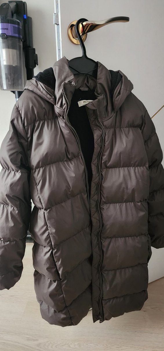 Kahverengi-gri tonlarında, dolgulu ve tokalı detaylı, normal uzunlukta kadın kışlık mont. Uzun kollu, kesimi vücuda oturan, günlük kullanıma uygun rahat bir tasarım. sadece 2 kez kullanıldı . hiç bir sorunu yok. 10-11 yaş