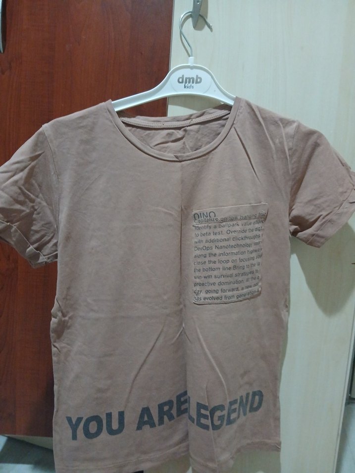 kahverengi renkli, pamuklu kumaştan yapılmış, kısa kollu kız tişörtü. Baskılı detaylara ve rahat bir görünüm için bol kesime sahiptir.