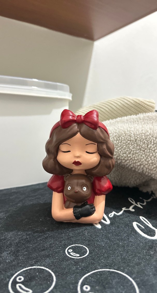 Kahverengi saçlı, kırmızı fiyonk ve elbise giymiş, gözleri kapalı kız figürünün küçük bir köpeği tuttuğu biblo. Siyah eldivenli.