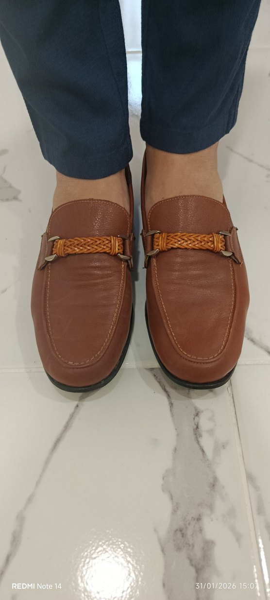 Parlak kahverengi deri erkek ayakkabısı, tokalı ve hafif yılan derisi desenli, klasik tarzda günlük kullanıma uygundur.
