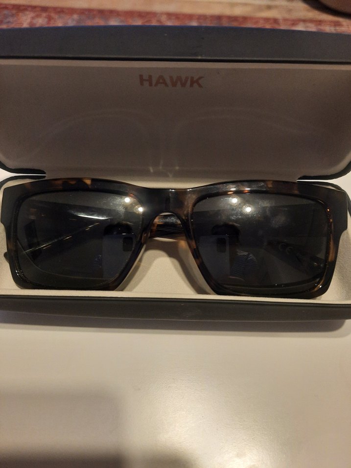 Kahverengi klasik kadın güneş gözlüğü, tokalı çerçeveye sahip, "HAWK" markalı.