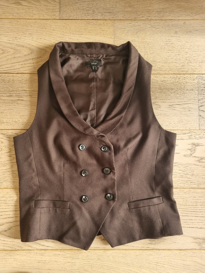 Kahverengi, düğmeli ve yakalı, kolsuz kadın yelek. Çok az kullanılmıştır. Ofis ve günlük kullanım için uygundur.