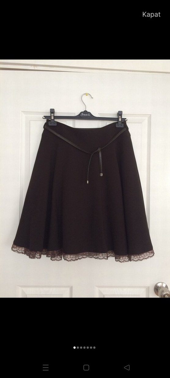 Sevil marka, 56 cm boyunda, kahverengi krep kumaştan, beli 8 cm korsajlı ve deri kemer detaylı, yandan fermuarlı ve astarlı,etek ucu simli dantelli geniş daire kloş etek. Abiye olarak kullanıma da uygundur. bir kez giyilmiştir yeniden farksızdır, sorunsuzdur.