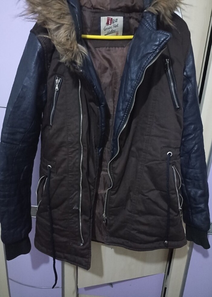Kahverengi kolları deri kapşonlu mont