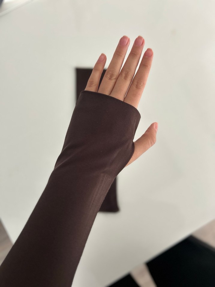 Minimalist tasarımlı koyu bej kadın eldiven, yumuşak sentetik kumaştan üretilmiş, avant-garde ve şık bir görünüm sunar.