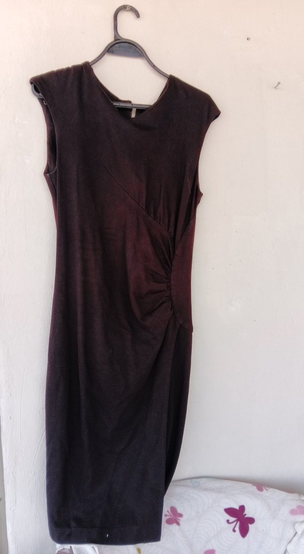 Kahverengi, kolsuz, midi boy keten kumaştan, kruvaze yakalı ve drapeli, ofis için uygun dar kesim elbise.
