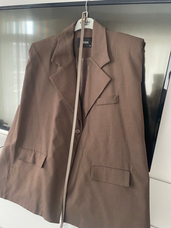 Kahverengi kolsuz, keten kumaştan yapılmış, kesimli yaka ve düğmeli ofis blazeri. Normal kesim ve midi boydadır.