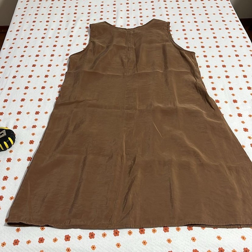 Kahverengi, kolsuz, uzun keten elbise, bisiklet yakalı ve dökümlü tasarıma sahip, bol kesim ve parlak kumaştan bohem tarzda.