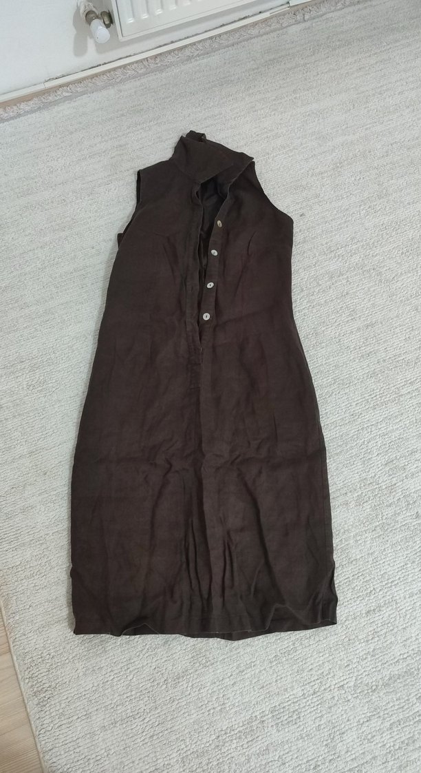 Kahverengi keten kumaştan, kolsuz ve düğmeli ön detaylı, yüksek yakalı, uzun ve vücuda oturan elbisedir. Günlük kullanıma uygundur.