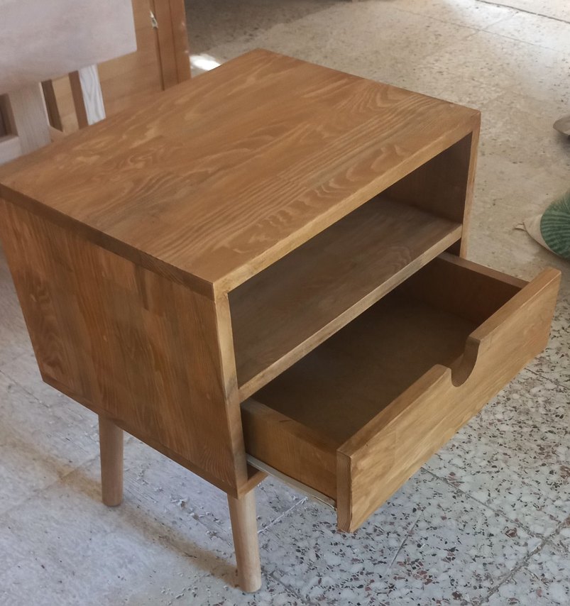 Parlak bej renkte, tek çekmeceli ve açık raflı çocuk komodin . Dört ayaklı, sade ve doğal tasarıma sahiptir.