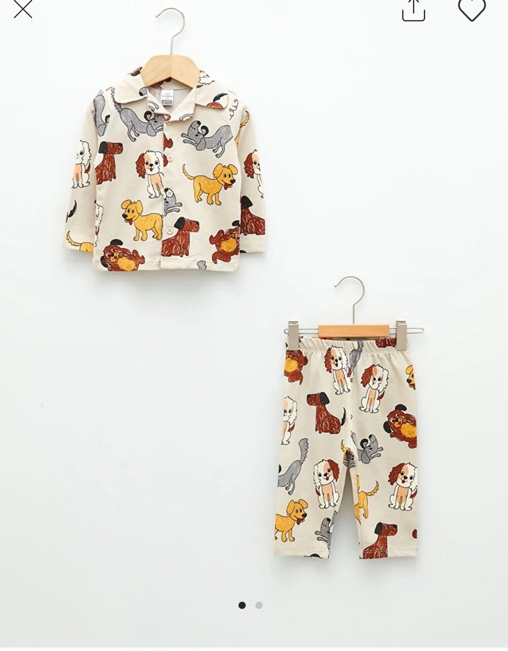 Kahverengi örgü kumaştan, farklı köpek desenlerinin baskılı pijama takımı. Hafif lekeleri mevcuttur