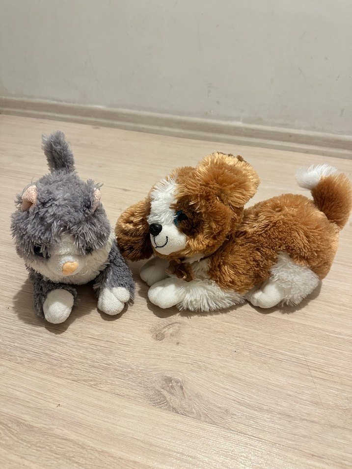 Yumuşak kumaştan yapılmış kahverengi köpek ve gri kedi peluş oyuncaklar. İkisi de yatar pozisyonda ve detaylı yüz ifadelerine sahip.