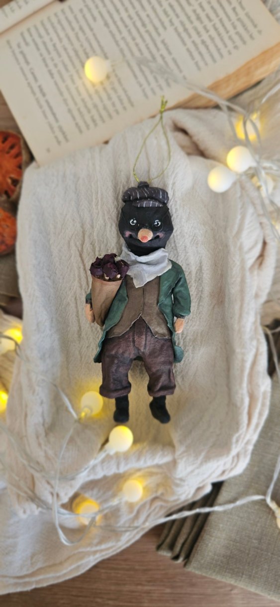 Yeşil ceketli, şapkalı ve çiçek tutan kahverengi koyu renkli detaylı figürin. Dekorasyon için uygundur. Örneği yoktur, tek üründür.