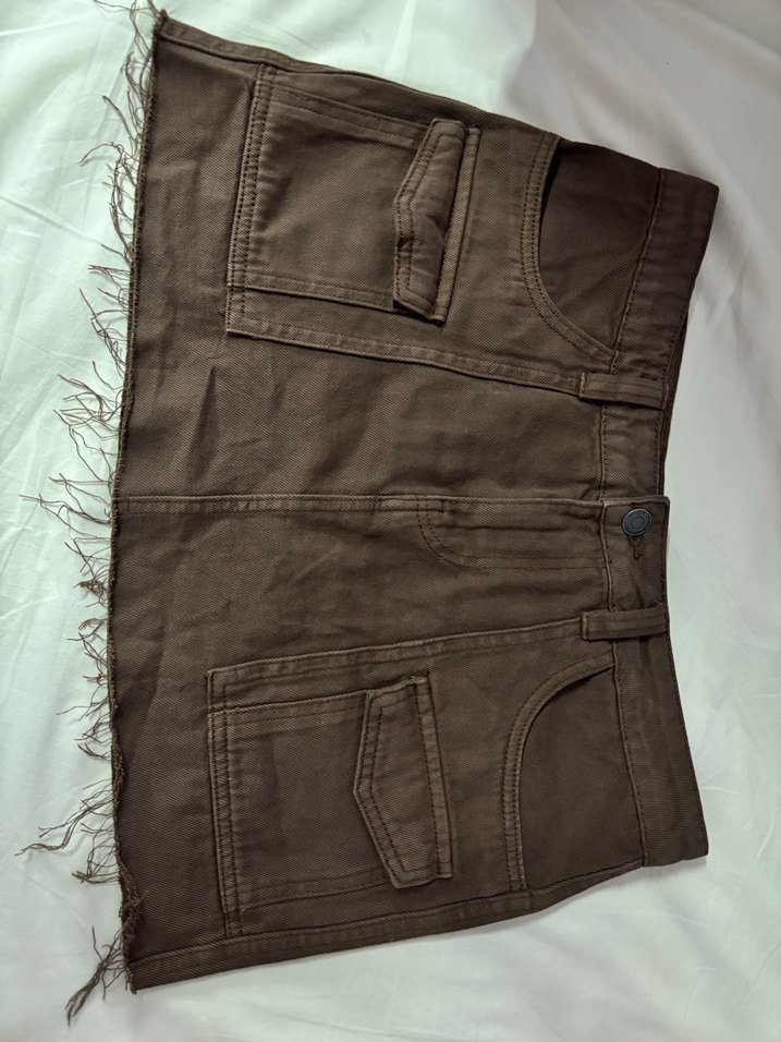 Kahverengi kot mini etek, bol kesim ve kemerli bel ile rahat bir tarz sunar. Çok cepli ve püsküllü etek ucu günlük sokak modasına uygundur.