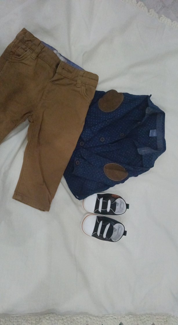 Kahverengi kot pantolon ve düğmeli, yaka detaylı koyu mavi ceket ile erkek bebek takımı. Siyah beyaz bebek ayakkabısı da dahildir.