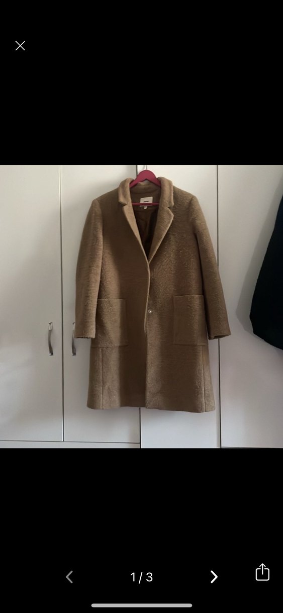 Kahverengi, uzun kollu kaban, klasik yakalı ve iki cep detaylıdır. Yumuşak ve sıcak dokusuyla soğuk havalar için uygundur.