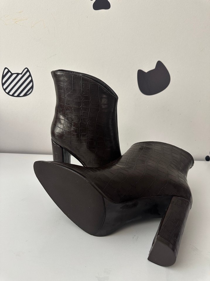 Kahverengi deri, kroko desenli kadın topuklu bot. Tokalı detayıyla çağdaş ve Paris esintili şık bir tasarıma sahip.