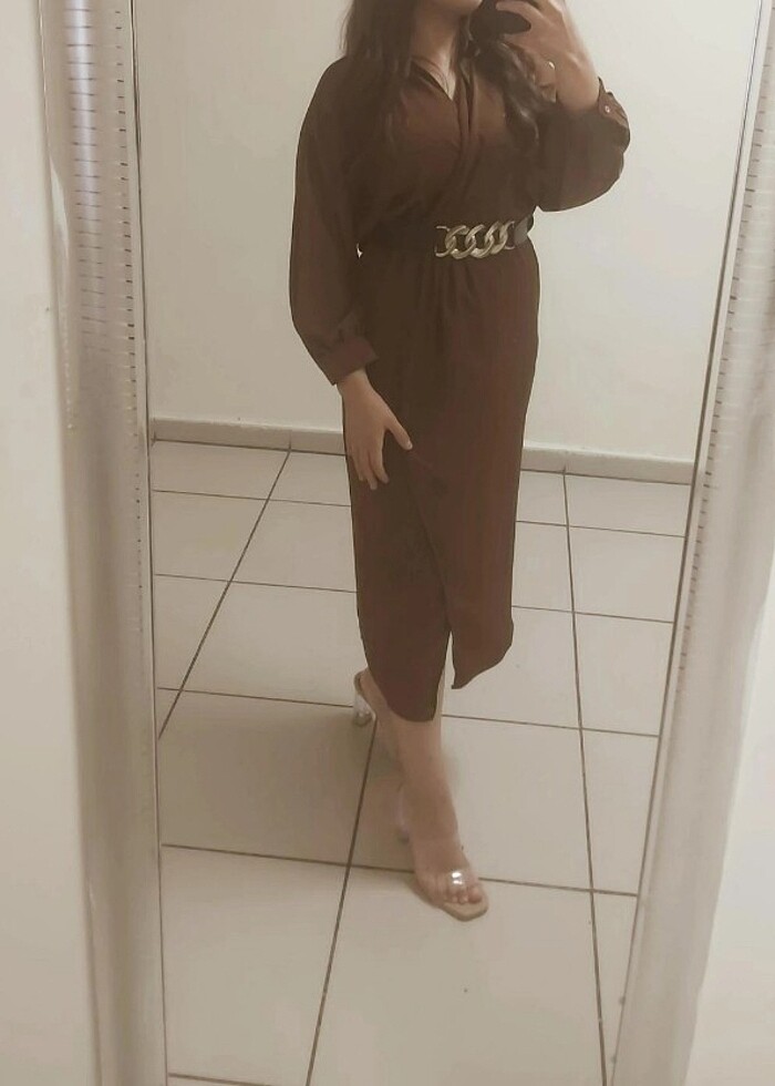 Kahverengi kruvaze kemerli elbise