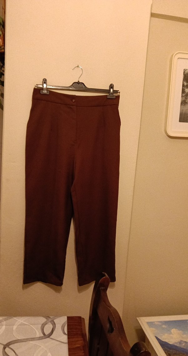 bol kesim kahverengi midi pantolon, vintage sokak stiliyle ofis için uygun. arka pacalarinda ufak yirtmacli ,yuksek bel ,son fiyattir