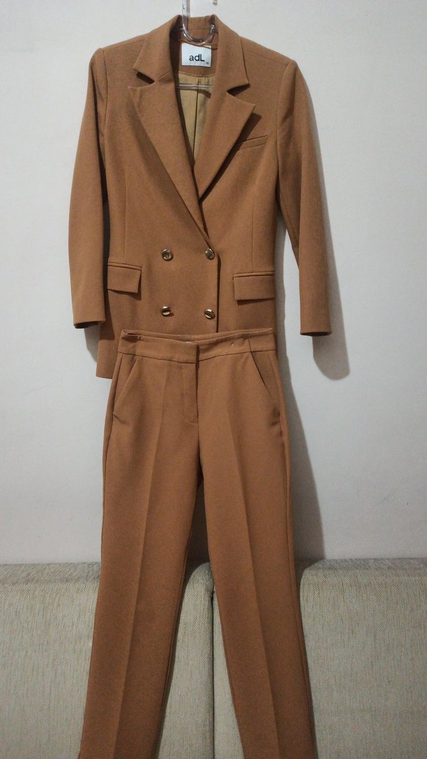 Kahverengi kumaştan yapılmış kadın takım elbise, normal kesim ve yaka detaylıdır. Düğmeli ve midi uzunlukta, askılı kollu ceket ile uyumlu pantolondan oluşur kısa boy uzunluğu sevenler için uygundur renk avantajına istinaden istenirse ayrı olarak da kombin yapılabilinir ayrıca Ofis için klasik ve sade normcore tarzındadır.