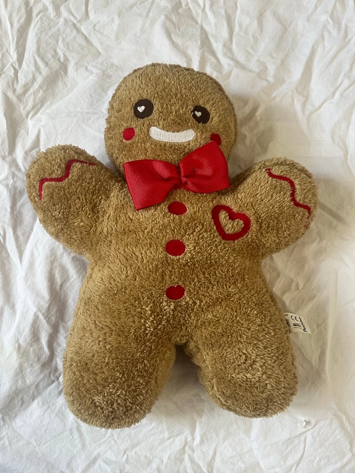 Kahverengi kurabiye adam şeklinde peluş oyuncak, kırmızı papyon ve düğmelerle renkli detaylara sahiptir, nakışlı gözler ve kalp süslemeleri bulunur.
