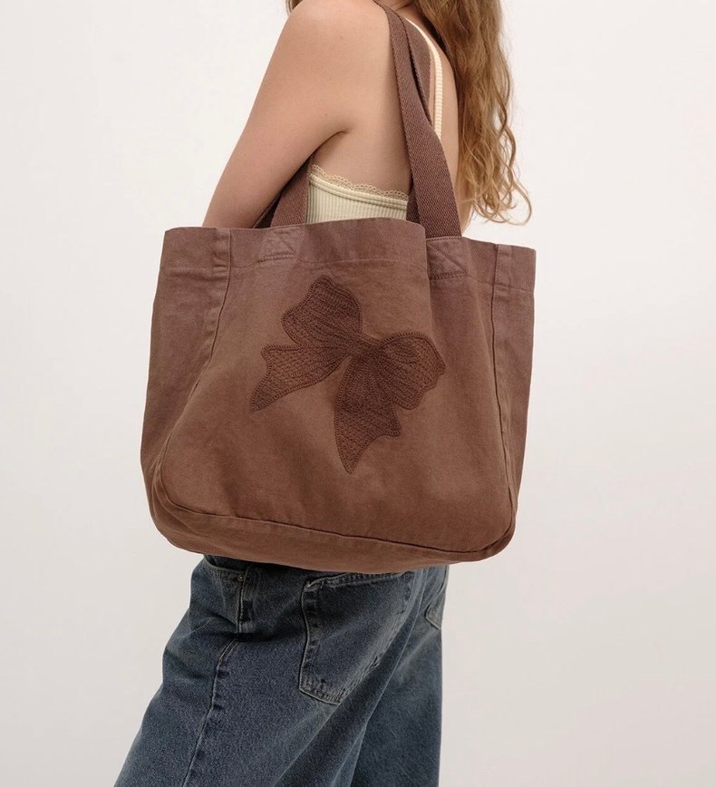 Kahverengi çanta, nakışlı fiyonk deseniyle pastel tonlarda. Günlük kullanıma uygun, rahat ve şık bir sokak stili çantası.