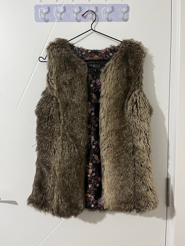 Kahverengi, kürk detaylı, çiçek desenli iç astarlı, askısız ve vücuda oturan bohem tarz yelek. Günlük kullanıma uygundur. Bershka marka boy 63cm göğüs 90cm bel 84cm