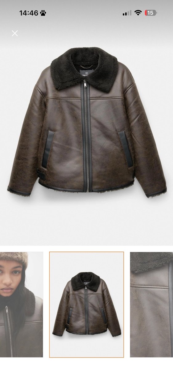 Kahverengi deri kadın ceketi, kürk detaylı ve kesik yaka ile tasarlanmıştır. Normal kesim, askılı kollar ve fermuarlı kapama özelliklerine sahiptir.