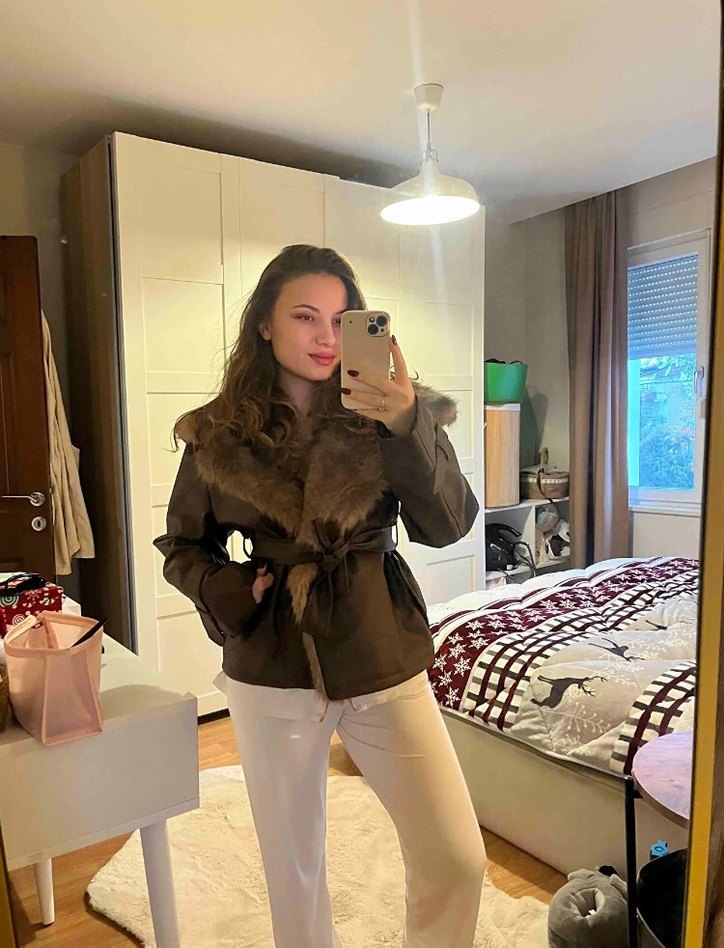 Kahverengi deri ceket, kürk detaylı yakası ve normal kesimiyle uzun kolludur. Midi boyu ve çıtlı yaka stree tarzı günlük kullanıma uygundur.