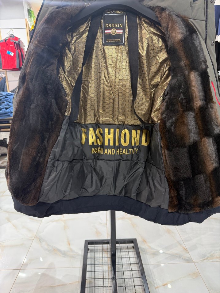 Suni kumaştan, kahverengi baskılı, kürk detaylı, crew yaka ve uzun kollu erkek ceketi, regular fit ve sokak stilini yansıtıyor.