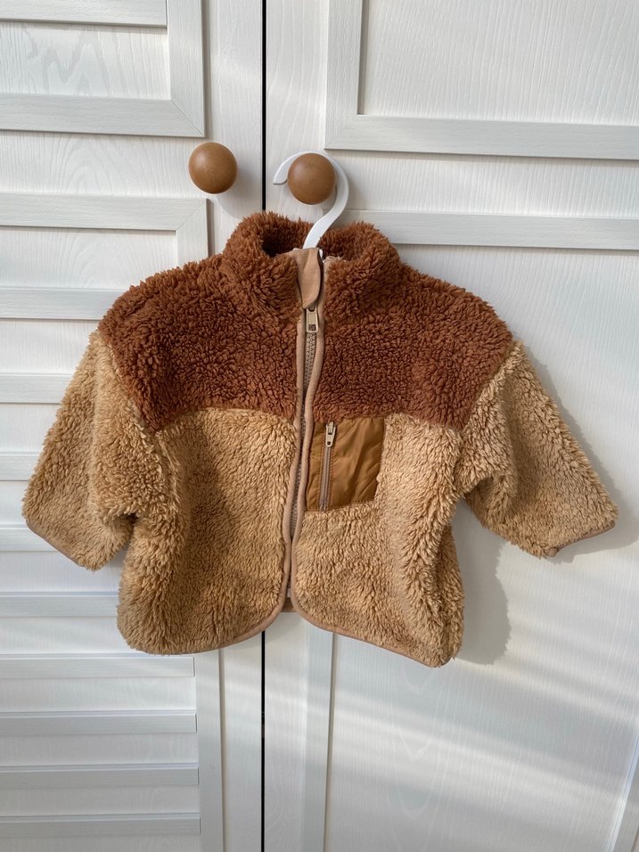 Bol kesim, kahverengi tonlarda yumuşak ve sıcak kumaştan yapılmış, yakası çentikli erkek çocuk ceketi. Kürk detaylı ve önünde küçük cep bulunur.