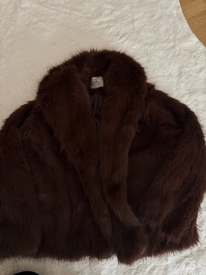 Kahverengi, uzun kollu ve kürk detaylı kadın mont, yumuşak fleece kumaştan, rahat ve gotik tarzda günlük kullanıma uygun.40 beden de mevcut