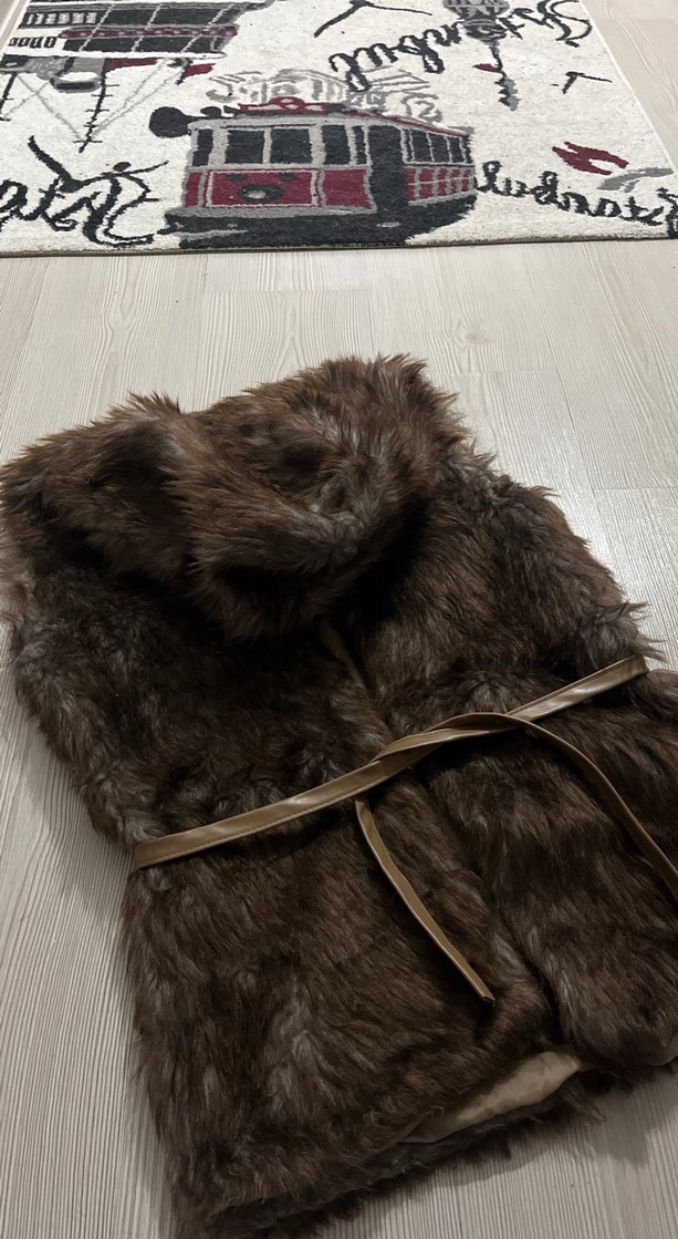Kahverengi, kürk detaylı, kolsuz ve normal boyda yelek. Fitted kesimi ve notched lapel yakasıyla günlük kullanıma uygun, bohem tarzda sıcak tutar. S-M beden