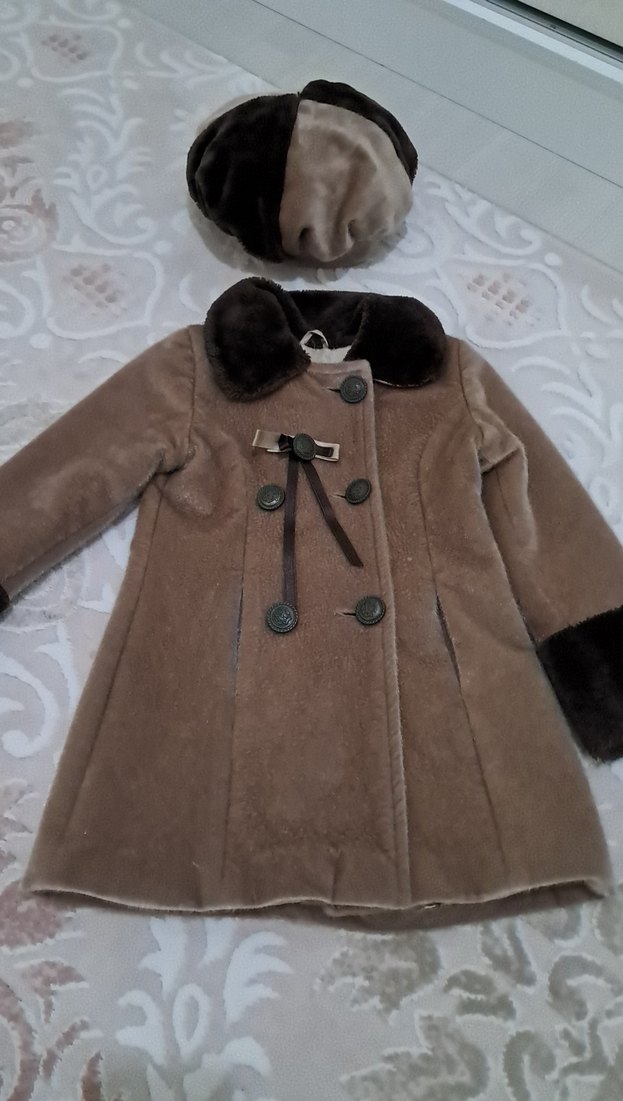 Kahverengi kız kabanı, kürk detaylı yaka ve manşetlere sahiptir. Modern klasik tarzda, rahat kesim ve yumuşak, sıcak kumaştan üretilmiştir.